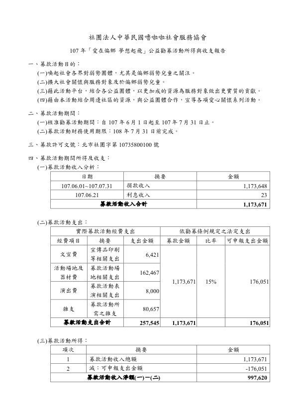 嚕啦啦107年公益勸募活動收入明細