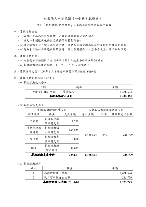 109 年第七屆愛在偏鄉公益勸募所得與收支報告