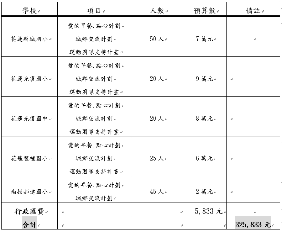 (三)經費用途:作為執行本計畫經費支應,如:早餐.點心計畫、城鄉交流計劃、運動團隊支持計畫等。